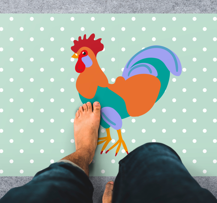 Descubre la magia de la alfombra vinílica animales arte del gallo vibrante, una pieza que transforma cualquier espacio con su diseño juguetón. Con una ilustración caricaturesca de un gallo en un patrón de fondo lleno de topos y lunares vibrantes, esta alfombra es la opción perfecta para aquellos que buscan darle vida a su hogar. ¡Su estilo alegre y colorido hará que cada rincón brille con personalidad!