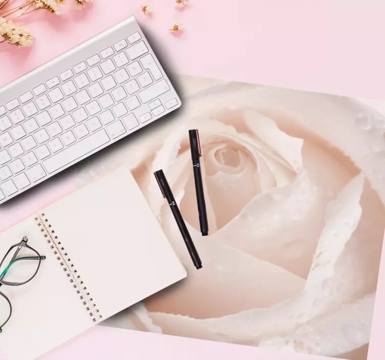 Descubre la magia de la naturaleza con nuestro Mouse pad original primer plano floral delicado. Este encantador diseño presenta un hermoso primer plano de pétalos de rosa en tonos blancos y suaves, capturando la esencia de la elegancia. Las gotas de agua que simulan la lluvia añaden un toque de frescura, mientras que la textura pura y delicada del producto transforma tu espacio de trabajo en un refugio de tranquilidad y belleza.