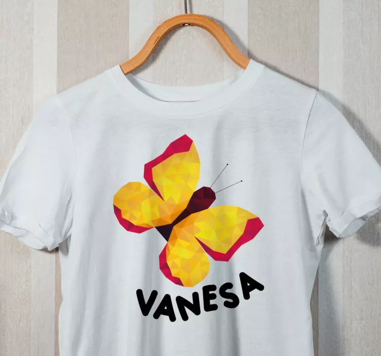 Referencia: T4993Este encantador diseño presenta una mariposa vibrante con una deslumbrante mezcla de tonos amarillos y rojos. Las formas geométricas añaden un toque moderno, mientras que la tipografía audaz del nombre realza su atractivo personal. Perfecto para mostrar una vibra alegre y juguetona.