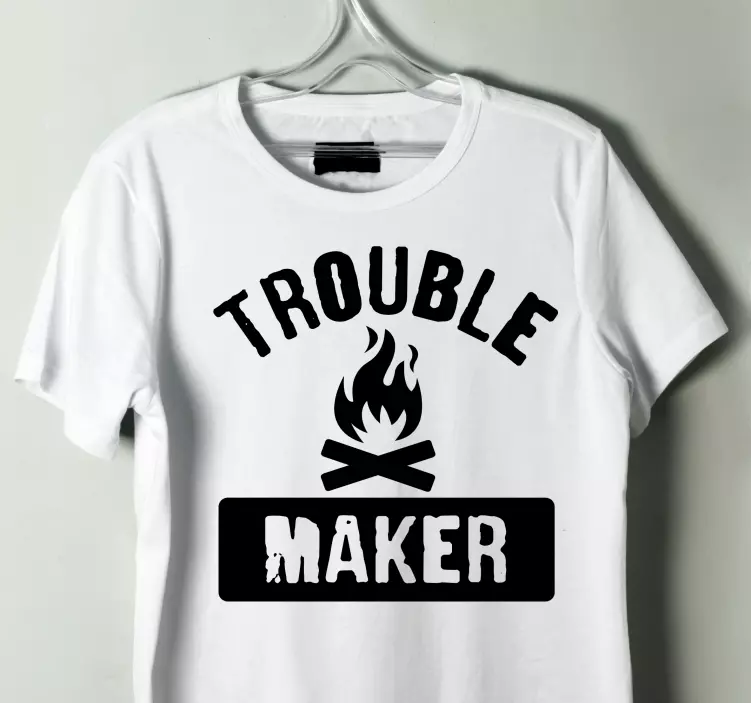 Referencia: T5448Este diseño llamativo presenta un texto en negrita que dice 'Trouble Maker' acompañado de símbolos de llama y fogata. Es perfecto para quienes abrazan un espíritu divertido y aventurero. El contraste de negro sobre blanco añade un elemento de emoción y capta la atención sin esfuerzo.