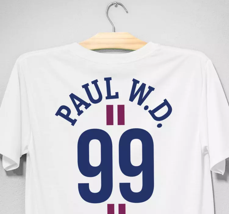 Si buscas un diseño simple pero atractivo que pueda actuar como una camiseta de fútbol, este producto es ideal para ti. Está hecho con algodón de calidad y pensado en tu satisfacción. El diseño cuenta con un nombre personalizado en color azul oscuro con las iniciales de tus otros nombres. Además, tiene el número 99 en la parte de atrás y dos franjas decorativas moradas en la parte superior e inferior.