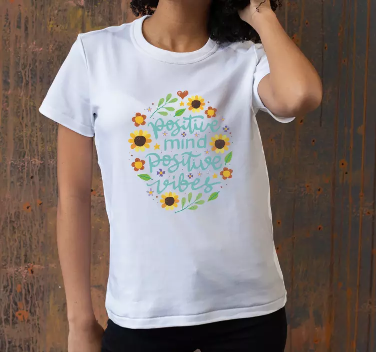 - Texto fluido en verde con una cita motivacional sobre vibraciones positivas y dibujos animados de coloridos girasoles