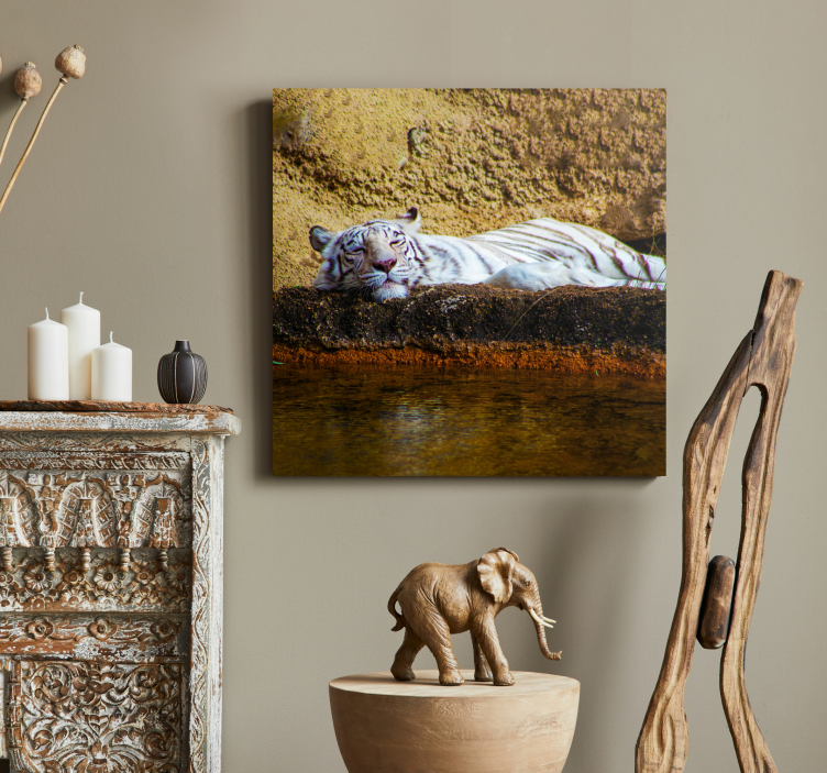 Referencia: Q6655Un momento sereno se captura con un tigre blanco descansando junto al agua, mostrando su comportamiento tranquilo. El tigre se recuesta contra un fondo texturizado, resaltando sus distintivas rayas y su expresión pacífica, rodeado de elementos naturales que realzan la escena.