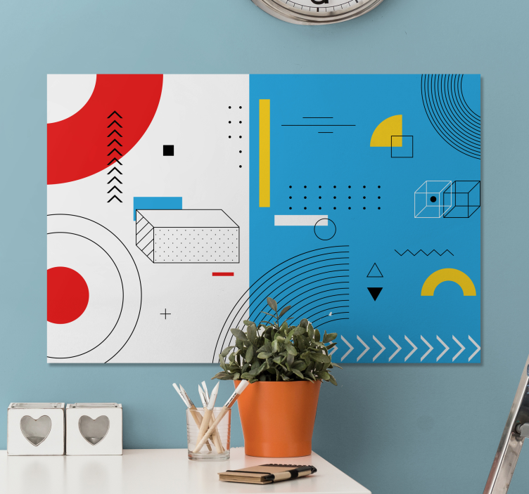 Descubre una pieza única que transforma cualquier espacio con su diseño abstracto y vibrante. Este cuadro presenta una composición armoniosa de formas geométricas, incluyendo círculos, triángulos, rectángulos, flechas y topos, todo dispuesto en un patrón cautivador que invita a la contemplación. Su estampado dinámico y colorido se convertirá en el centro de atención en tu hogar, aportando un toque contemporáneo y artístico que enamora a primera vista.