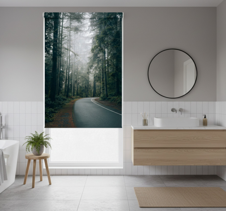 Persiana enrollable árboles camino de pinos nebulosos