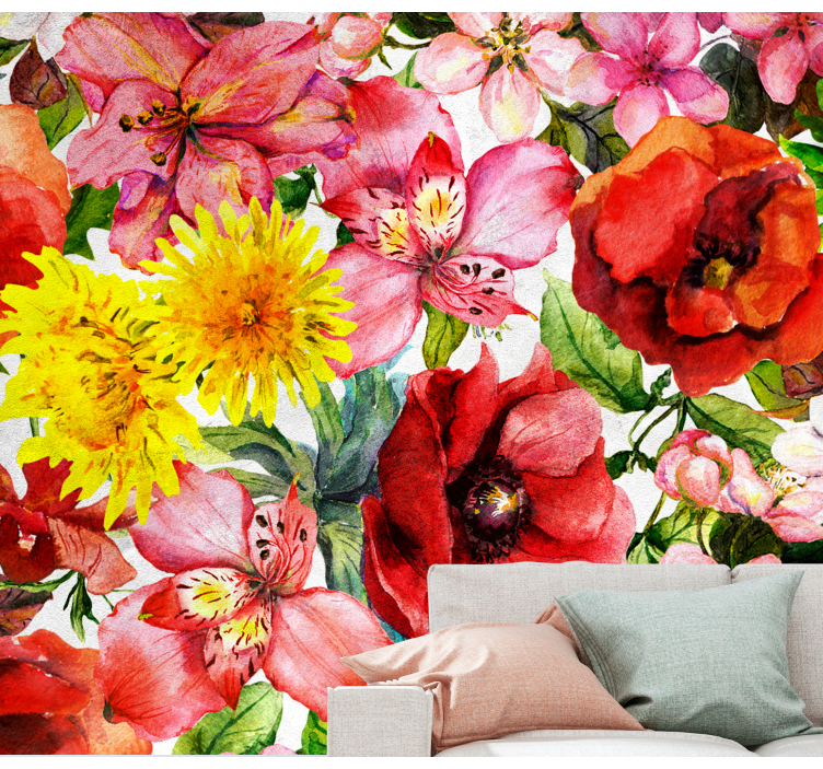 Este fantástico mural de flores muestra bellas amapolas y flores.
