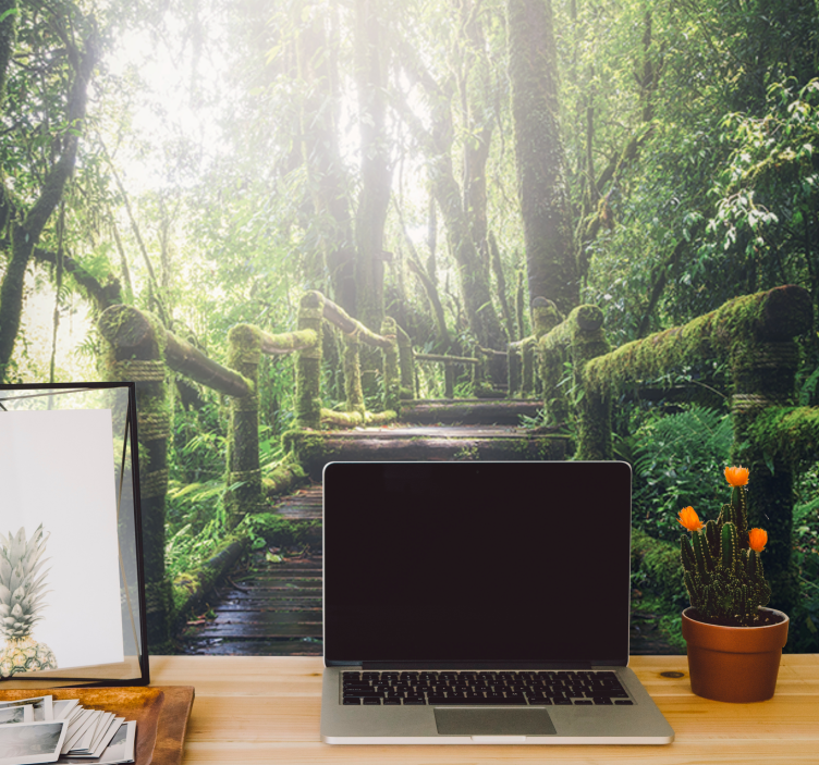Descubre la belleza única del Mural de naturaleza sendero del bosque frondoso, donde un sendero iluminado por la luz del sol te invita a explorar un mundo natural lleno de vida. Este diseño captura la esencia de un bosque frondoso, con árboles majestuosos y un camino adornado de musgo, creando una atmósfera tranquila y rejuvenecedora en cualquier espacio. La fotografía vibrante de la ruta y la escalera añade un toque de realismo que transformará tus paredes en un refugio de paz.