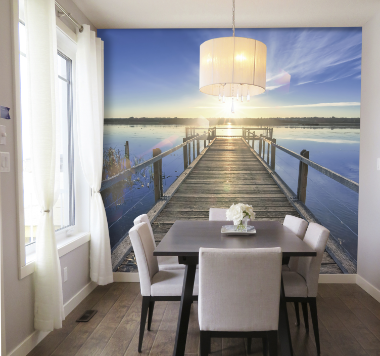 Descubre la magia del Mural de paisajes vista del atardecer en el muelle, un diseño impresionante que evoca la serenidad de un atardecer sobre el agua. Con un efecto 3D cautivador, este mural presenta un hermoso cielo azul, un muelle de madera que se extiende hacia la pasarela de la ruta, invitándote a soñar y disfrutar de la tranquilidad de la naturaleza.