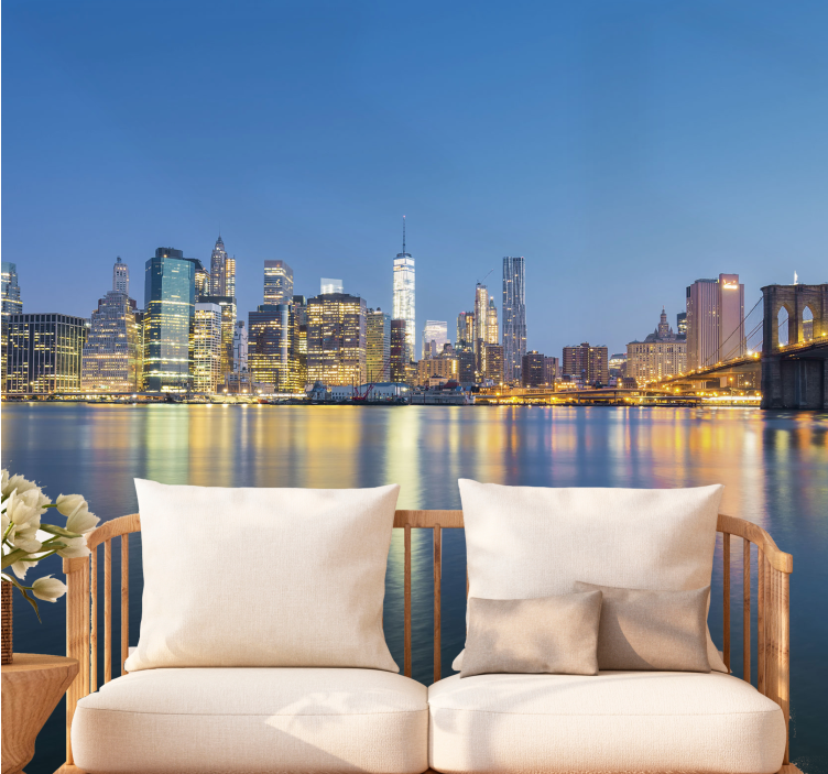Referencia: F12099El diseño presenta una vista impresionante del horizonte de Nueva York, exhibiendo estructuras icónicas iluminadas al anochecer. La escena incluye el Brooklyn Bridge arqueándose con gracia sobre el agua, complementado por las vibrantes luces de la ciudad reflejándose en la superficie, creando una atmósfera pintoresca.