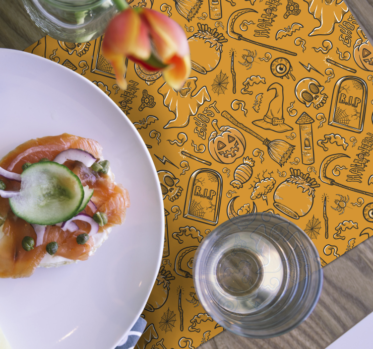 ¡Descubre un toque espeluznante para tus celebraciones! Este Individual mesa Halloween motivos tenebrosos presenta un vibrante patrón de color naranja que captura perfectamente la esencia de la Víspera de Todos los Santos. Con dibujos de fantasmas, calaveras, calabazas, arañas y lápidas, este mantel individual se convertirá en el centro de atención de cualquier mesa, añadiendo un ambiente festivo y tenebroso que hará que tus invitados se sientan encantados!