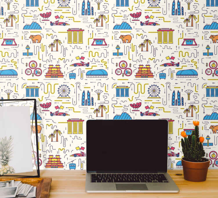 El papel pintado de papel está decorado con múltiples ilustraciones icónicas que representan diferentes puntos de referencia de la ciudad de Singapur. Este producto es ideal para la decoración de oficinas y hogares, así como otros espacios.