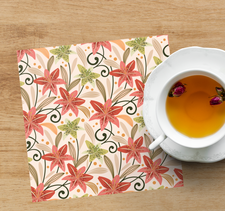 Descubre la belleza de nuestros portavasos con accentos de patrón floral, una auténtica obra de arte que combina ilustraciones de flores y lirios en un diseño moderno y vibrante. Este estampado está inspirado en la naturaleza, presentando colores vívidos que llenarán tu hogar de frescura y alegría. Cada pieza es un homenaje a la estética floral que transforma cualquier espacio en un paraíso visual.