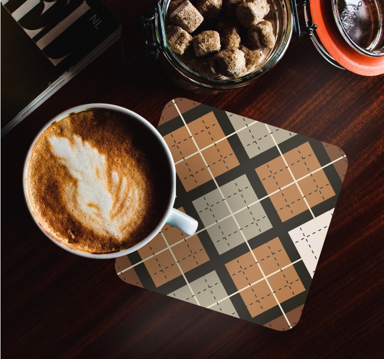 Los portavasos diseño geométrico cuadrados presentan un estilo visualmente cautivador que combina diamantes y patrones a cuadros en una elegante cuadrícula. Este estampado geométrico se adorna con tonos cálidos que añaden un toque acogedor a cualquier espacio. Sus texturas únicas y el cruce de formas crean un ambiente moderno y sofisticado, perfecto para realzar la decoración de tu hogar.