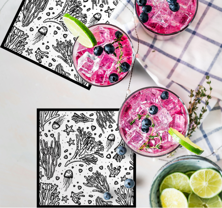 ¡Descubre la belleza del océano en tu hogar con nuestros portavasos elementos de vida submarina! Este diseño cautivador presenta un intrincado patrón en blanco y negro que evoca la esencia de la vida marina, con dibujos de corales, algas marinas, medusas y estrellas del mar. Cada pieza es una obra de arte que transporta la serenidad del fondo marino a tu mesa, convirtiendo cada sorbo en una experiencia visual única.