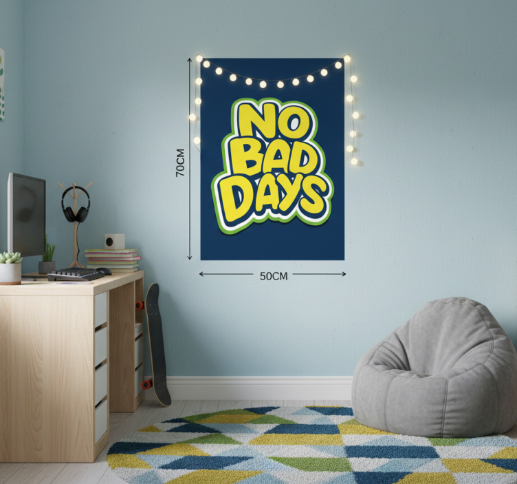 El Poster habitación juvenil no más días malos es la elección ideal para añadir un toque de positividad y energía a cualquier habitación. Este poster no solo decora, sino que también inspira y motiva a quienes lo ven. Su diseño alegre invita a recordar que cada día puede ser una nueva oportunidad para brillar. ¡Haz que tu espacio hable de ti y de tus sueños!