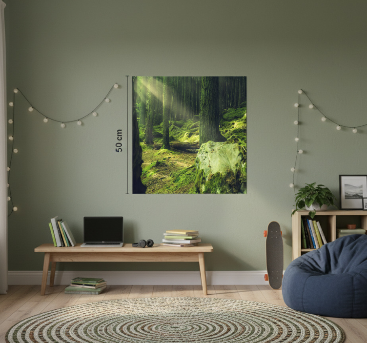 La aplicación del Poster salón piedras con musgo en el bosque es muy sencilla. Te recomendamos usar cinta adhesiva de doble cara en la parte posterior para un acabado limpio y profesional. También puedes optar por enmarcarlo o usar chinchetas para una instalación rápida. Asegúrate de sostener cada tira firmemente durante 10 segundos para asegurar una buena fijación. ¡Crea tu espacio ideal en un instante!