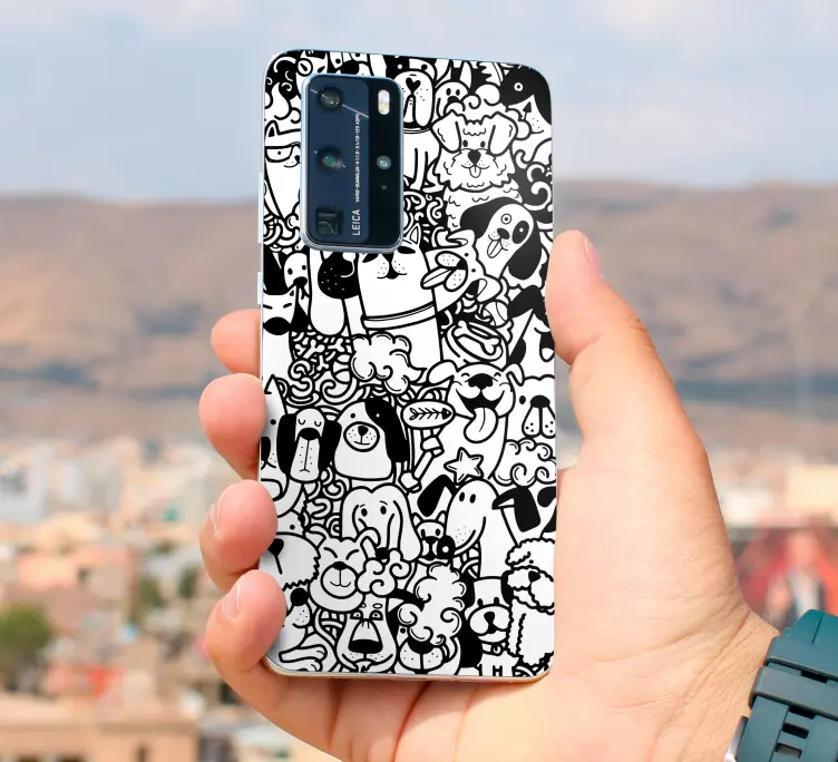 Descubre nuestra Pegatina Huawei motivos de perros juguetones, un diseño divertido y encantador que presenta adorables perros y cachorros en un patrón gracioso. Este estampado en blanco y negro no solo embellece tu teléfono, sino que también refleja tu personalidad juguetona y amante de los animales. ¡Haz que tu móvil destaque y sea un verdadero reflejo de tu estilo!