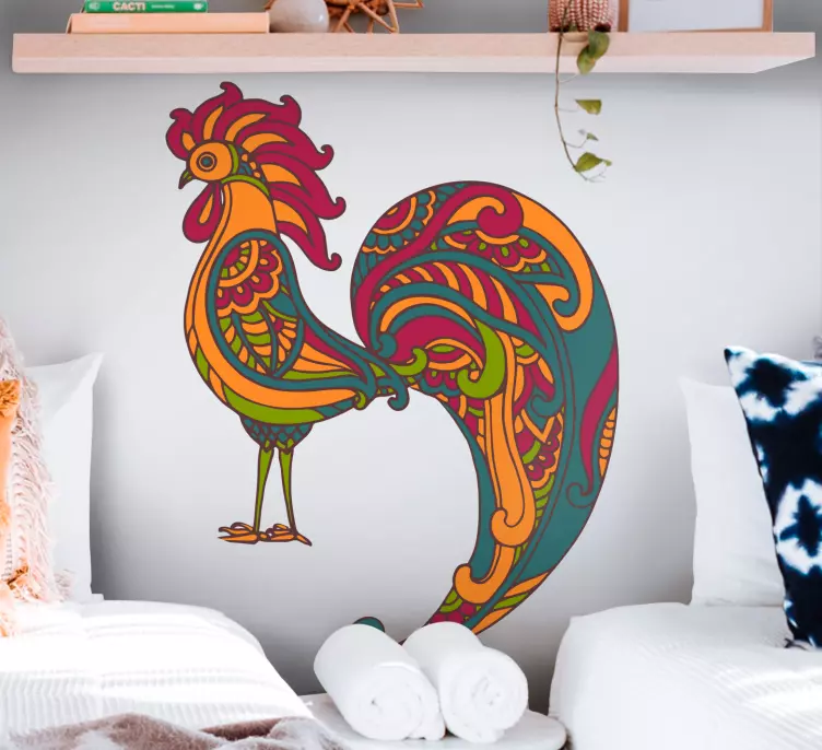Descubre nuestro vinilo animal de granja diseño de gallo colorido, una pieza artística que fusiona la esencia del campo con un diseño vibrante y étnico. Este gallo, en su silueta florido, se convierte en el elemento decorativo perfecto para cualquier espacio. Su colorido aporta energía y alegría, transformando tus paredes en una celebración visual del mundo rural.