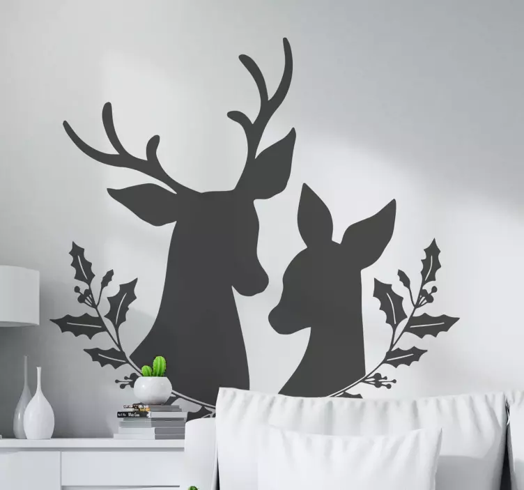 Referencia: A46840Una encantadora representación de dos ciervos con intrincados cuernos y expresiones suaves, enmarcados por ramas de acebo. Este diseño evoca una sensación de calidez y conexión con la naturaleza, perfecto para transformar cualquier espacio en un ambiente sereno y acogedor.