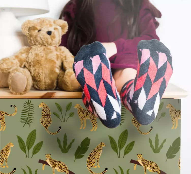 Descubre el encantador vinilo animal salvaje patrón de leopardo en la jungla, una obra de arte que captura la esencia de la naturaleza en un vibrante patrón que combina la elegancia del leopardo con la exuberancia de las hojas y la fauna silvestre de la selva. Este estampado tropical y floral en tonos de verde es perfecto para transformar cualquier espacio, dándole un toque exótico y lleno de vida. Ideal para decorar muebles y paredes, esta pieza es un verdadero homenaje a la jungla y su majestuosa belleza.