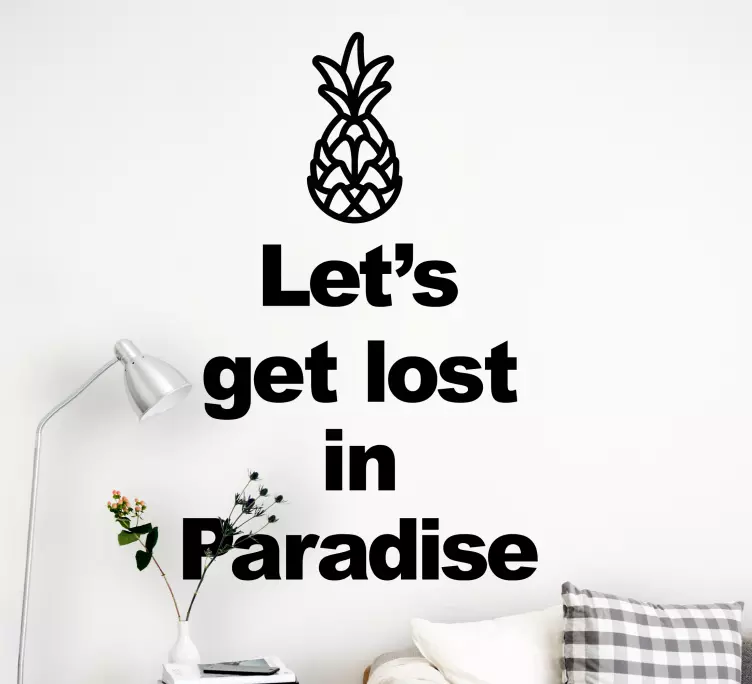 Referencia: A48933Esta composición presenta una declaración en texto negrita acompañada de una ilustración de una piña. El diseño invita a una sensación de aventura y relajación, animando al espectador a abrazar la idea de escapar al paraíso. Perfecto para realzar cualquier espacio habitable con un ambiente tropical.