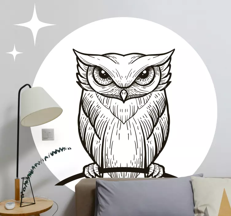 Descubre el encantador vinilo cabecero búho sabio intrincado, una ilustración que captura la esencia de la naturaleza con un diseño circular que destaca un búho rodeado de estrellas. Este arte en blanco y negro es perfecto para aquellos que buscan una decoración detallada y única, creando un ambiente mágico y acogedor en cualquier espacio.