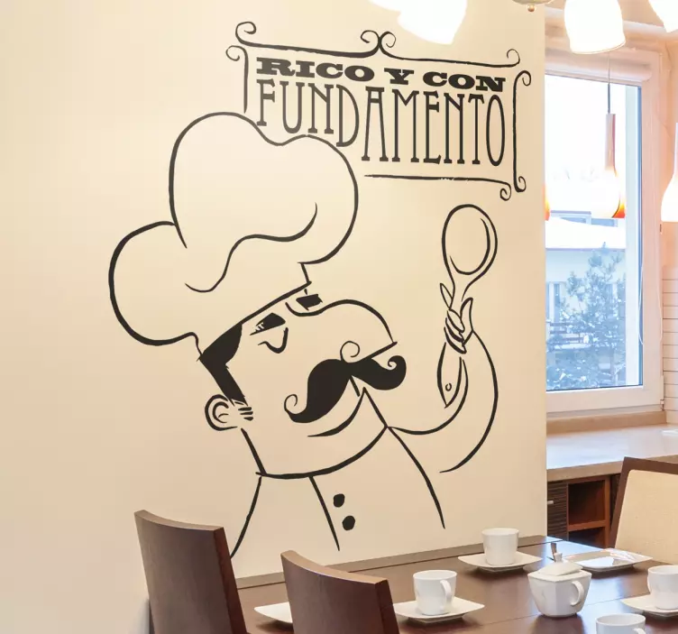 Referencia: A4304Vinilos para cocina con una ilustración exclusiva de tenvinilo.com en la que aparece un chef preparado para preparar un suculento menú con un texto a su derecha que dice "rico, rico y con fundamento". Vinilos decorativos ideales para darle un toque personalizado y humorístico a tus fogones.