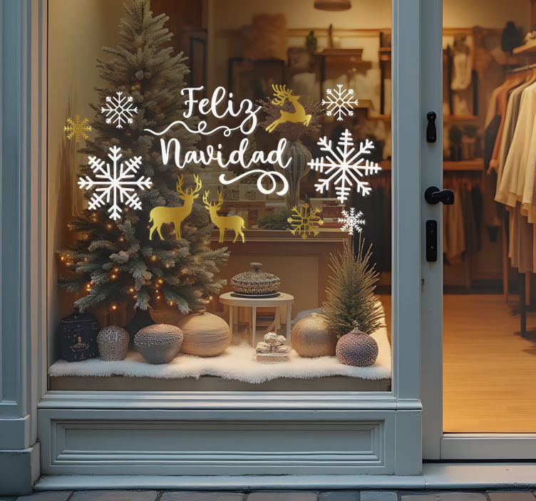 Referencia: A41747Descubre la belleza de la naturaleza con nuestro Vinilo escaparate paisaje de ciervos dorados. Este diseño personalizado, que incorpora elementos festivos como un menú y texto, transforma cualquier espacio en un rincón mágico ideal para la Navidad. Con sus ciervos dorados, el vinilo aporta un toque de elegancia y calidez, perfecto para celebrar la temporada.