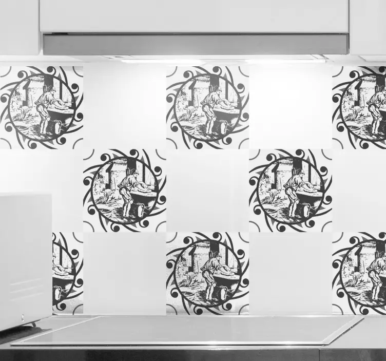 Descubre la belleza del vinilo escena de artesanía vintage, una obra que captura la esencia de la creatividad y el arte en su máxima expresión. Este diseño impresionante presenta una escena de horneando en un entorno que emula el estilo de los azulejos, combinando la artesanía con un toque artístico y abstracto. Su elegante paleta en blanco y negro añade un aire de sofisticación, convirtiéndolo en un elemento decorativo ideal para cualquier espacio.