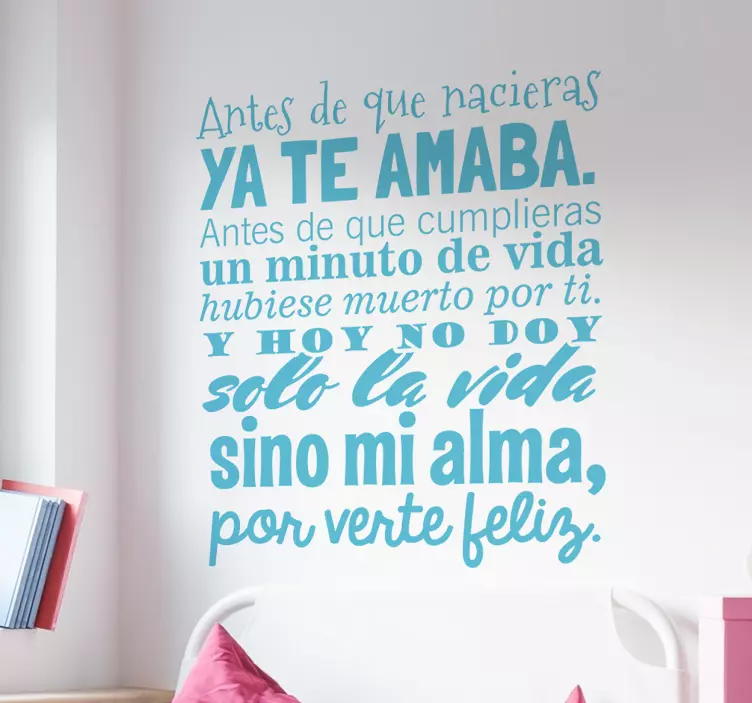 Referencia: A11440Vinilos originales con el texto "antes de que nacieras ya te amaba. Antes de que cumplieras un minuto de vida hubiese muerto por ti. Y hoy no doy solo la vida sino mi alma por verte feliz". Un lindo poema en vinilo decorativo disponible en el tamaño y color que requieras.