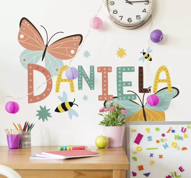 Referencia: A51997Diseño juguetón que presenta mariposas vibrantes junto a un nombre personalizable. Ideal para habitaciones infantiles, esta encantadora obra de arte realza una atmósfera cálida mientras introduce elementos de la naturaleza y alegría. Las mariposas encarnan un sentido de libertad, añadiendo un toque de fantasía a cualquier espacio.