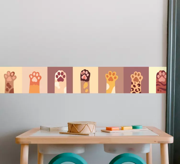 Descubre el encantador vinilo huellas de patas alegres, donde un diseño vibrante de azulejos y dibujos animados se entrelaza con patas de diferentes animales, creando una cenefa llena de vida. Este patrón vistoso, ideal para cualquier amante de las mascotas, transforma tu espacio en un refugio alegre y acogedor, gracias a su estampado único que evoca la alegría de nuestros amigos de cuatro patas.