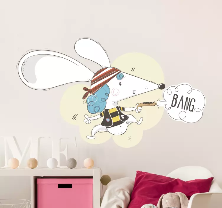 Referencia: A47215Una representación caricaturesca y divertida de un ratón vestido de pirata, completo con un sombrero a rayas y cabello azul. El personaje caprichoso sostiene un juguete y exclama 'BANG', añadiendo un sentido de diversión y aventura, perfecto para espacios infantiles.