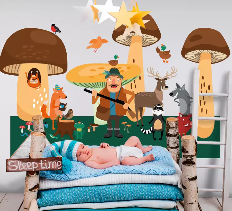 Descubre un mundo encantado con nuestro vinilo infantil aventura en el bosque de animales. Este diseño caprichoso presenta encantadoras ilustraciones de animales rodeados de setas y un hermoso bosque, creando un ambiente mágico y acogedor ideal para la habitación de los niños. Perfecto para la hora de acostarse, este vinilo transforma cualquier espacio en un rincón de naturaleza donde la fauna silvestre cobra vida, estimulando la imaginación de los más pequeños.
