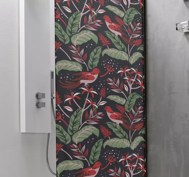 Transforma tu espacio con el vibrante Vinilo mampara ducha concepto ave botánica, que presenta un hermoso diseño de hojas y aves en un patrón floral. Este estampado, lleno de vida y color, evoca la esencia de la naturaleza con tonos verdes y rojos que aportan frescura y alegría a tu baño. ¡Es el detalle perfecto para quienes aman la naturaleza y desean un ambiente acogedor!