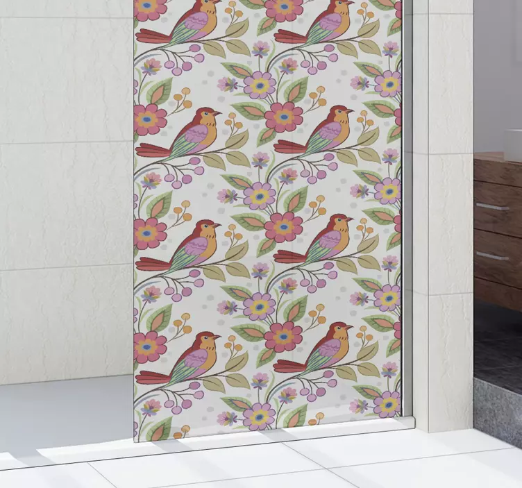 Transforma tu baño en un oasis de naturaleza con nuestro Vinilo mampara ducha patrón de aves coloridas. Este diseño gráfico destaca por su vibrante estampado de aves y flores, creando una atmósfera alegre y refrescante. Con cada mirada, disfrutarás de la belleza del patrón que evoca la esencia de la naturaleza, haciéndolo un elemento vistoso y encantador en tu espacio.