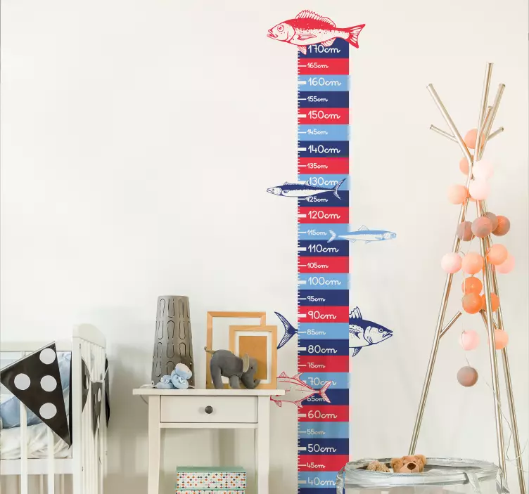 Referencia: A44979Con un divertido gráfico de medición de altura, este diseño integra ilustraciones vibrantes de peces junto con marcas de medición claras. Sirve como una herramienta funcional para seguir el crecimiento y como un atractivo acento, haciéndolo perfecto para la habitación de un niño. Los colores alegres realzan cualquier espacio.