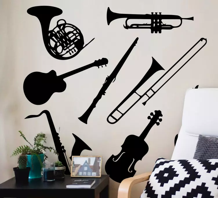 Descubre el arte de la música con nuestro Vinilo música colección de instrumentos musicales, donde las siluetas de instrumentos se fusionan en una decoración única. Este diseño vibrante evoca la esencia de una orquesta, llenando tus espacios de música y estilo. ¡Perfecto para los amantes del arte y la música!
