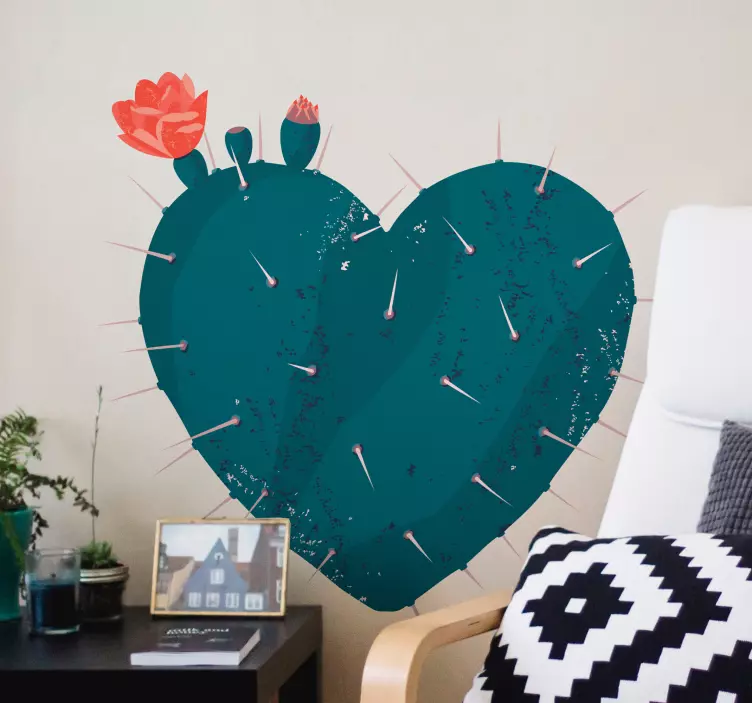 Descubre la belleza de la naturaleza con nuestro vinilo naturaleza cactus en forma de corazón. Este diseño único combina la forma de un hermoso corazón con la esencia de los cactus, resaltando sus espinas y adornado con encantadoras flores rosadas. La ilustración captura la esencia de la naturaleza, haciendo de esta pieza un elemento decorativo vibrante y lleno de vida que transformará cualquier espacio.
