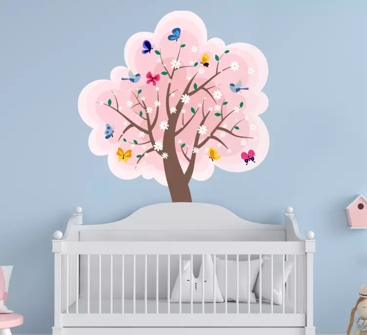 Descubre la belleza de la naturaleza con nuestro Vinilo naturaleza escena de Árbol en flor. Este diseño vibrante presenta un espléndido árbol en flor, rodeado de delicadas mariposas que danzan en un paisaje de colores rosados y alegres. La ilustración evoca la frescura de la primavera, creando un ambiente acogedor y vivaz en cualquier espacio. ¡Es una obra de arte que transformará tu hogar!