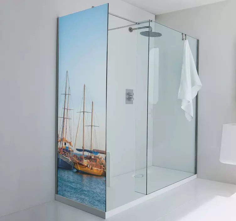 Personaliza tu mampara de ducha con nuestro vinilo autoadhesivo 3D original. Su diseño ilustra un hermoso muelle con muchos barcos, que sin duda mejorará enormemente el aspecto del lugar de baño turístico.