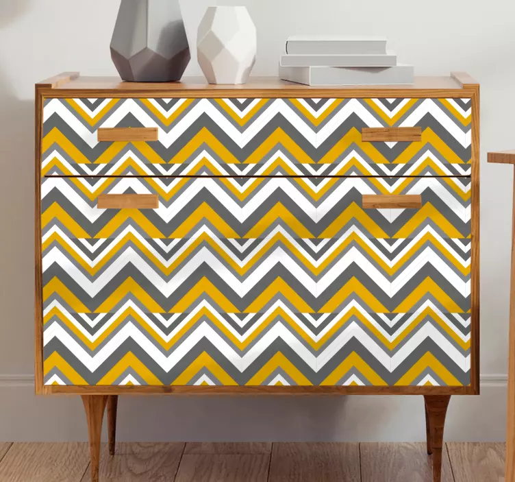 Transforma tu espacio con el Vinilo para mueble chevron en superposición, un diseño que combina formas geométricas en zigzag y triángulos, creando un atractivo patrón nórdico. Los tonos vibrantes de amarillo y gris ofrecen un toque moderno y fresco, ideal para dar vida a cualquier mueble. Este estampado es perfecto para quienes buscan un cambio estilístico sin complicaciones.