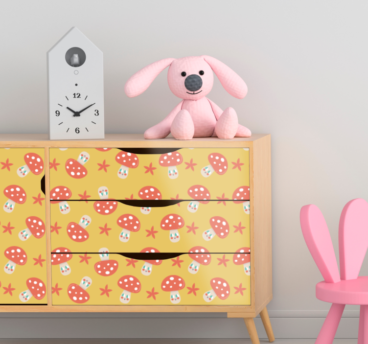 Descubre la magia del vinilo para mueble diseño de setas que transforma cualquier espacio en un mundo caprichoso y juguetón. Con un vibrante fondo amarillo, este diseño presenta la icónica Amanita muscaria rodeada de estrellas y setas, perfecto para la decoración infantil. Es una forma divertida de añadir un toque de naturaleza a tus muebles, haciéndolos únicos y llenos de vida.