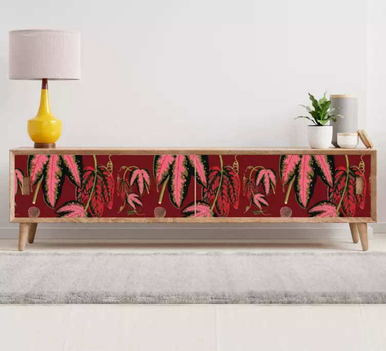 Descubre el vinilo para mueble motivo de hojas exuberantes, un diseño cautivador que combina la belleza de la flora con un vibrante estampado en tonos de rojo, verde y rosado. Este patrón floral está inspirado en la maranta, brindando un toque natural y fresco a tus muebles. Perfecto para quienes buscan un acento de muebles que resalte la elegancia y el estilo en cualquier espacio.