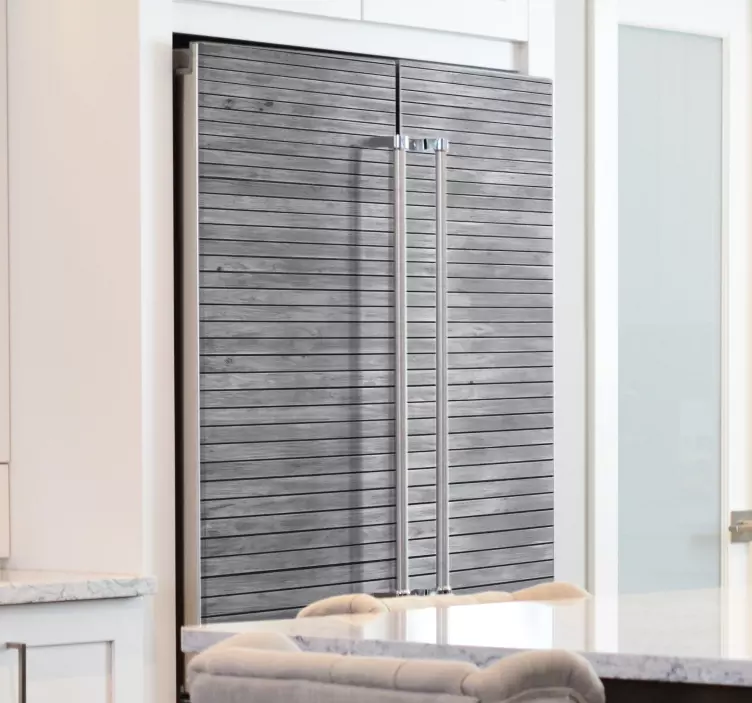 Transforma tu cocina con el Vinilo para nevera apariencia de madera texturizada, que evoca la calidez y el estilo de la madera gris en tablones horizontales. Este diseño moderno agrega un toque acogedor a tu refrigerador, nevera o frigorífico, dándole un aspecto renovado y atractivo que complementa perfectamente cualquier decoración de cocina. ¡Deja que tu heladera hable de tu estilo!