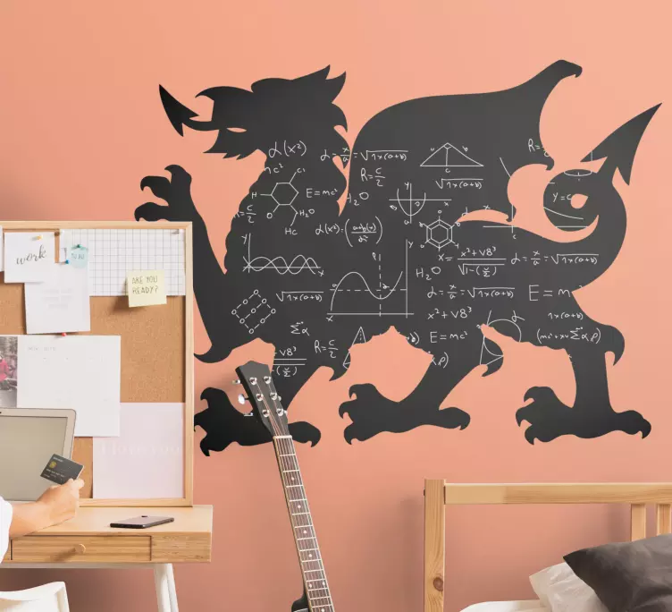 El vinilo pizarra silueta de dragón galés es una obra de arte que combina un diseño gráfico impresionante y estilizado. Su silueta representa un emblema galés que evoca la fuerza y la tradición, todo en una forma geométrica única. Este adhesivo no solo es visualmente atractivo, sino que también proporciona un espacio perfecto para continuar explorando la creatividad, ya que puedes escribir matemáticas o cualquier otra idea que surja en tu mente.