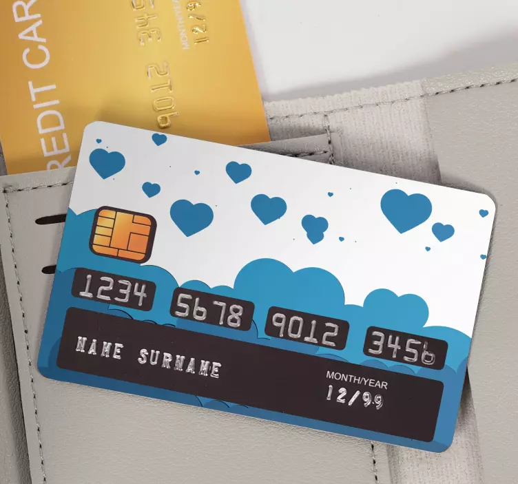 Descubre nuestro vinilo tarjeta de crédito patrón de nubes con corazones, un diseño gráfico que combina la ternura de los corazones y la suavidad de las nubes en un hermoso fondo azul. Este adhesivo es perfecto para dar un toque juguetón a tu tarjeta de crédito, transformándola en un elemento único que refleja tu estilo y amor. ¡Haz que cada vez que saques tu tarjeta, sea una experiencia llena de alegría y color!